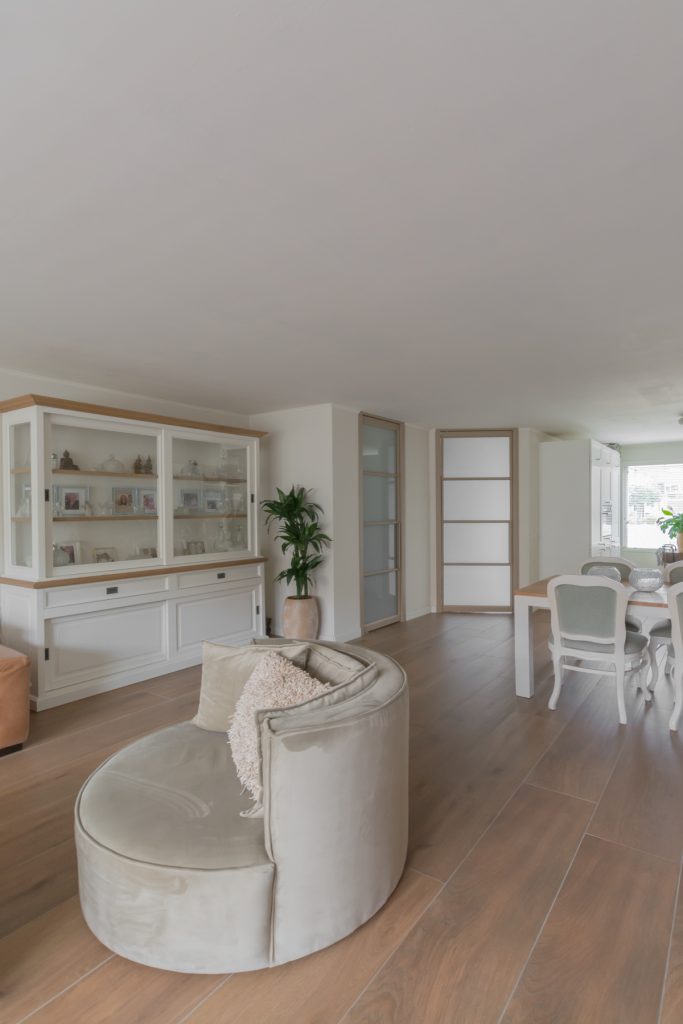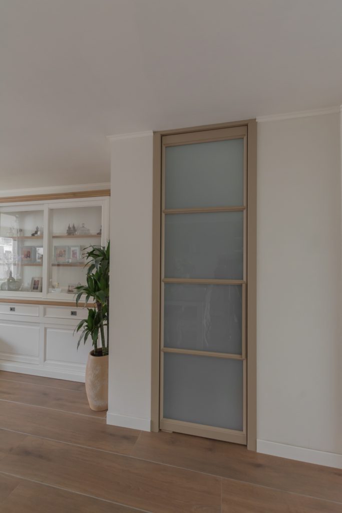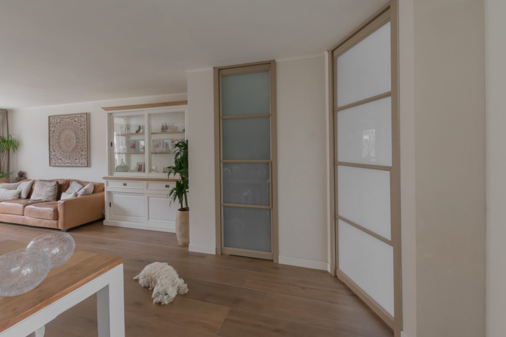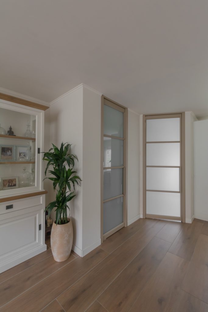 De ene taatsdeur verbindt de woonkamer met de kleine hal en de ander staat voor de trapkast. Beide deuren zijn voorzien van melkglas, wat in dit geval ook heel praktisch is. De voorraad in de kast en de jassen, schoenen en tassen aan de kapstok in de hal zijn daardoor niet zichtbaar. Door de toegepaste bekleding van de kozijnen is een geheel andere look ontstaan, zonder dat er hak of breekwerk aan te pas gekomen is. Al met al is het een hele fijne rustige leefruimte geworden voor mens én dier!